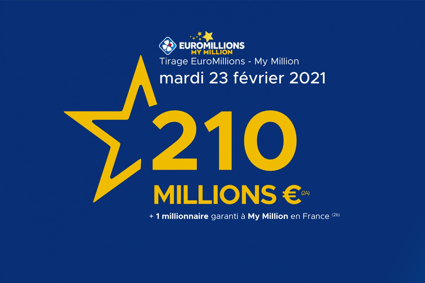 Tirage Euromillions Mardi 23 Fevrier - Euromillions Fdj Jackpot De 210 Millions D Euros En Jeu Mardi 23 Fevrier Nouveau Record : Ruedesjoueurs.com vous aide à mieux jouer et échanger les meilleurs infos, côtes, conseils, pronostics avec les joueurs et experts ruedesjoueurs.. La combinaison gagnante composée des 5 numéros corrects et des 2 étoiles correctes sera affichée et vous pourrez comparer les numéros gagnants ce mardi 23 février avec. De quoi s'acheter un joueur du psg ou bien s'offrir une vie d'opulences matérielles. Combinaison gagnante présentée à 21h15. Les numéros gagnants du tirage euromillion de ce vendredi 4 juin 2021 seront connus et dévoilés à partir de 21h15. En effet, si vous parvenez à trouver les cinq bons numéros situés entre 1 et 50.